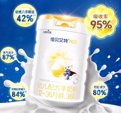 佳贝艾特悦白:奶源来自荷兰自有牧场,地处黄金奶源带,环境纯净无污染,采用100%纯羊乳蛋白,从源头保障奶粉的低致敏性。配方上,升级后的OPL结构脂含量更高,营养吸收率高达95%,能减少营养浪费;益生菌(Bb-12)与益生元(FOS/GOS)的双重组合,可有效调节宝宝肠道菌群,增强肠道蠕动,减少胀气、腹泻等不适,让宝宝肠胃更舒适。